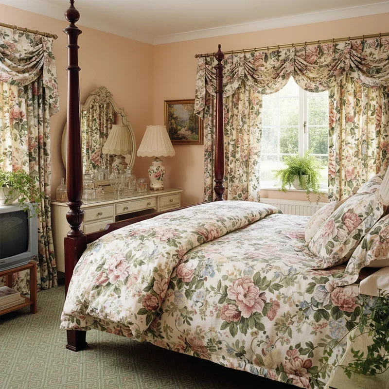 Dive into the romantic side of 80s design with chintz fabrics that transform your bedroom into an English garden exploding with roses, peonies, and endless botanical prints. These glossy, floral-covered textiles appeared on everything from bedspreads to lampshades, creating coordinated looks that bordered on obsessive. Choose large-scale floral prints in pink, peach, or blue backgrounds for authentic period style. Mix different floral patterns if you're feeling brave; the 80s certainly weren't afraid of pattern mixing. The glazed cotton finish of true chintz adds subtle shine that catches light beautifully. Balance these busy patterns with solid-colored walls to prevent sensory overload. Modern chintz-inspired fabrics offer the look without the stiffness of traditional versions. This maximalist approach to pattern celebrates abundance and femininity, creating bedrooms that feel like romantic retreats from the decade's harder edges.
