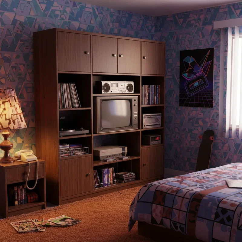 Design your bedroom around a massive entertainment center that houses both vintage electronics and modern tech in 80s-appropriate style. These furniture behemoths featured multiple levels for TVs, stereos, VCRs, and vast cassette collections, becoming shrines to home entertainment. Choose oak or black laminate finishes with glass doors and interior lighting to showcase your collection. Modern versions accommodate flat screens while maintaining period-appropriate bulk and presence. Display vintage boom boxes, Walkmans, or gaming systems as decorative objects that tell your personal 80s story. Cable management becomes crucial for maintaining clean lines despite multiple devices. Include storage for physical media like vinyl records or VHS tapes that add authentic texture. Your entertainment center anchors the room's design while providing practical storage and display space. This furniture piece transforms your bedroom into a multimedia retreat celebrating both past and present technology.