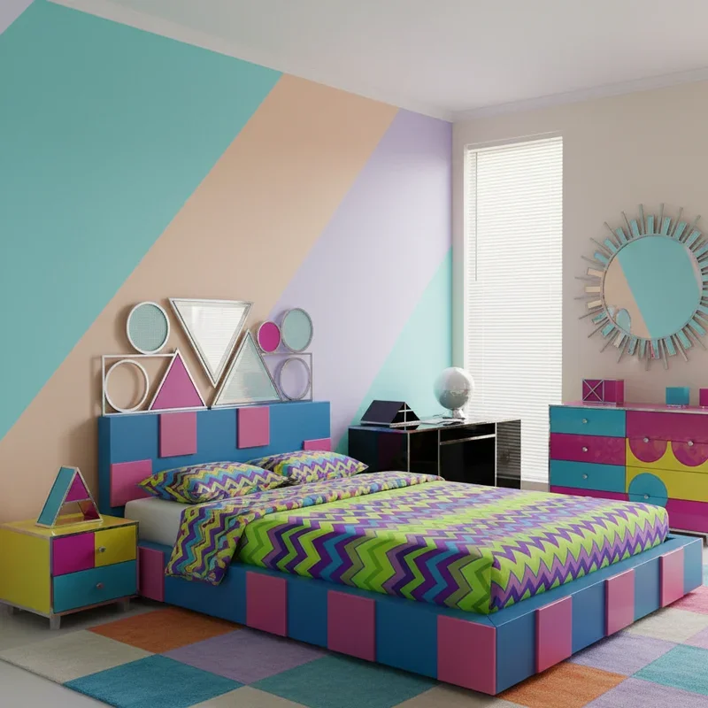 Furnish your space with tables, chairs, and storage units that reject traditional rectangles in favor of triangles, circles, and abstract shapes that defy convention. Triangular nightstands, circular beds, or zigzag bookshelves bring Memphis design principles into three-dimensional form. These pieces function as sculpture while serving practical purposes, making every furniture item a conversation starter. Choose pieces in bold colors or patterns that complement your overall scheme without exactly matching. The unexpected shapes create visual interest and challenge traditional room layouts. Modern reproductions of classic 80s designs offer better construction than some vintage pieces while maintaining authentic aesthetics. Mix geometric furniture with conventional pieces to prevent your room from feeling like a geometry lesson. This approach to furniture design celebrates creativity and playfulness, rejecting the notion that functional items must be boring or predictable.