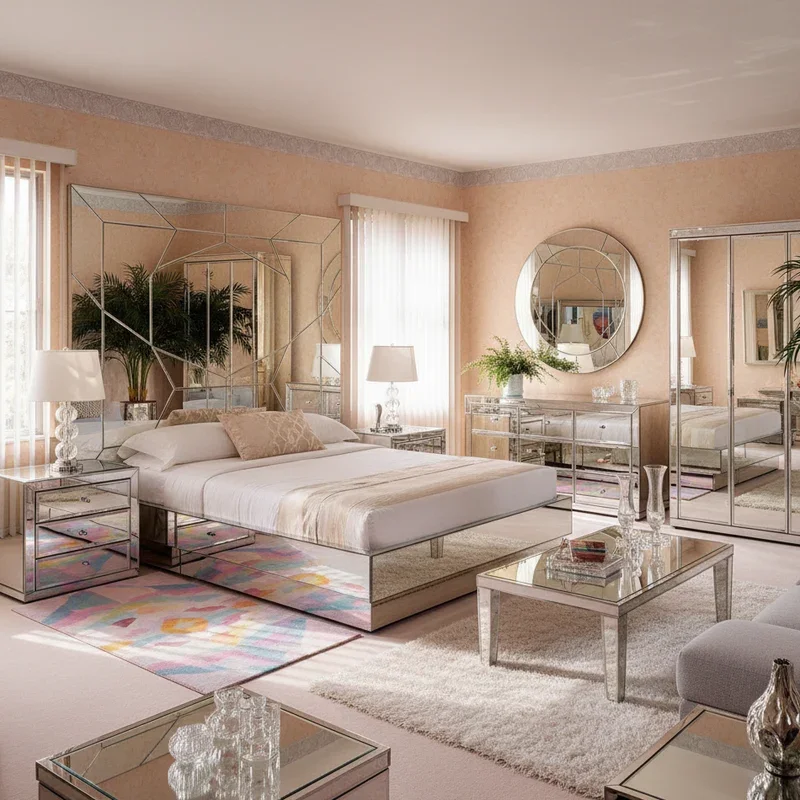Nothing says 80s glamour quite like furniture that doubles as a disco ball, reflecting light and creating illusions of space throughout your bedroom. Mirrored nightstands, dressers, and vanities transform ordinary furniture into glamorous statement pieces that catch every ray of light. These reflective surfaces make rooms appear larger while adding that essential touch of Hollywood Regency style the 80s adored. Mix mirrored pieces with matte finishes to create textural interest and prevent your room from feeling like a funhouse. Consider mirrored trim on regular furniture for a subtler approach that still captures the era's essence. The maintenance requires extra attention, but the dramatic effect justifies the effort. Position mirrored furniture strategically to reflect windows or artwork, multiplying their visual impact. This trend brings luxury and light into your space while maintaining that essential 80s excess.