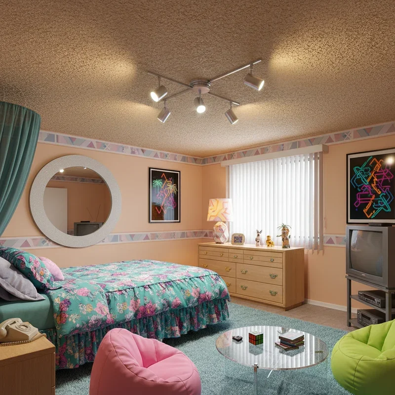 Love it or hate it, popcorn ceilings defined 80s architecture, and paired with track lighting, they create authentic period ambiance that's surprisingly cozy. The textured ceiling treatment adds acoustic dampening while hiding imperfections, though modern applications use safer materials than vintage versions. Track lighting systems allow you to direct light exactly where needed, creating dramatic spotlighting for artwork or reading areas. Choose black or white tracks depending on your ceiling color, and consider adding colored bulbs for mood lighting options. The adjustable nature of track lighting makes it practical for bedrooms where lighting needs change throughout the day. Position tracks strategically to highlight your favorite 80s collectibles or movie posters. While popcorn ceilings remain controversial, they undeniably capture the era's aesthetic when done intentionally rather than inherited. This combination brings theatrical lighting possibilities into your personal space.