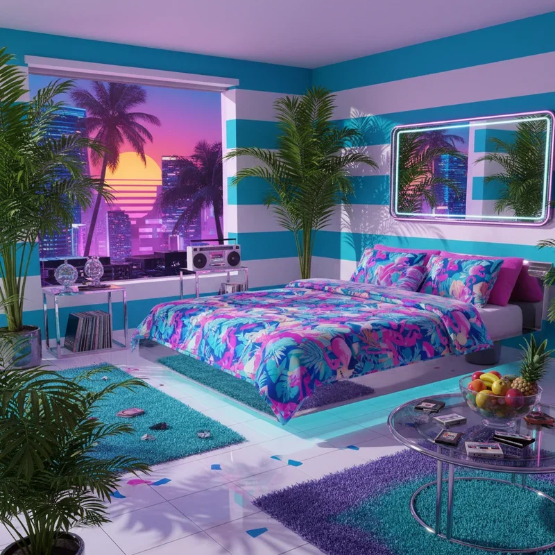 Channel the sultry glamour of 1980s Miami with a tropical theme that combines pastel architecture, palm prints, and art deco influences into one cohesive design. Think pink flamingos, palm frond patterns, and ocean-inspired colors that transport your bedroom to South Beach circa 1985. Incorporate white furniture with pink or turquoise accents, adding brass details for metallic glamour. Tropical plant prints on bedding or wallpaper establish the theme without requiring actual palm trees. Consider adding real tropical plants if your bedroom gets adequate light. Venetian blinds casting striped shadows complete the noir atmosphere. Mix in art deco elements through geometric mirrors or streamlined furniture for sophisticated edge. This theme works particularly well in bedrooms with good natural light that enhances the bright color palette. Your bedroom becomes a permanent vacation destination celebrating the decade's obsession with Miami's unique aesthetic.