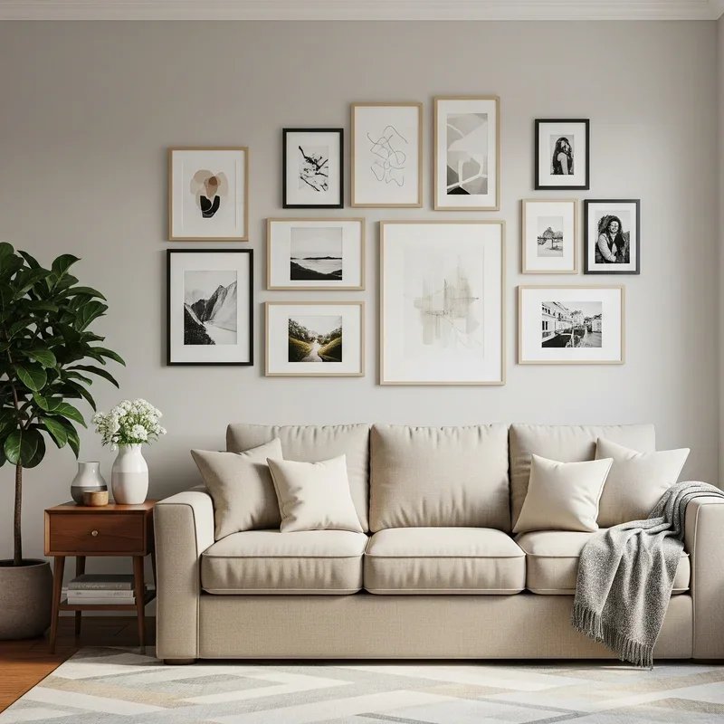 Create a sophisticated gallery atmosphere by incorporating black and white photography that adds artistic depth without introducing competing colors to your beige-centered space. Frame vintage family photos, architectural prints, or landscape photography in identical frames for cohesion, or mix frame styles for collected-over-time authenticity. Arrange photos salon-style above your couch, creating a visual story that invites closer inspection. The monochromatic nature of black and white photography complements beige beautifully, adding contrast without chaos. Include various sizes from large statement pieces to smaller grouped arrangements that create rhythm and movement. Personal photographs mixed with professional prints add intimacy to sophistication. The timeless quality of black and white imagery ensures your decor won't date quickly, while the neutral palette allows your beige couch to remain the room's grounding element. This approach adds personality and visual interest while maintaining the elegant restraint that makes beige furniture so versatile.
