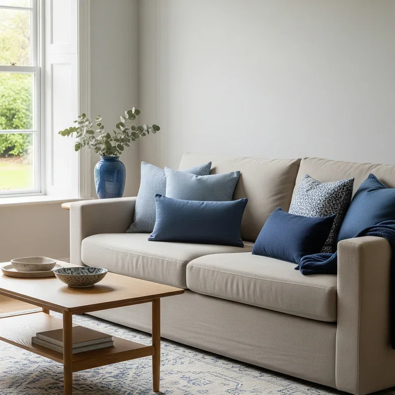 Harness the classic appeal of blue and beige, a combination that never fails to deliver timeless elegance and visual harmony. Navy throw pillows, indigo artwork, or a cobalt ceramic lamp create stunning contrast against your neutral sofa without overwhelming the space. This tried-and-true pairing works because blue's coolness balances beige's warmth, creating perfect equilibrium. Add pattern through blue and white chinoiserie vases, striped pillows, or ikat prints that keep the look fresh and current. A navy accent wall behind your beige couch creates dramatic backdrop while maintaining sophistication. Layer different blue tones from powder to midnight, creating depth and preventing monotony. Include natural elements like blue agate bookends or lapis lazuli decorative objects that add luxury. This color combination transcends trends, working equally well in traditional, contemporary, or transitional settings, proving that some pairings achieve classic status for good reason.