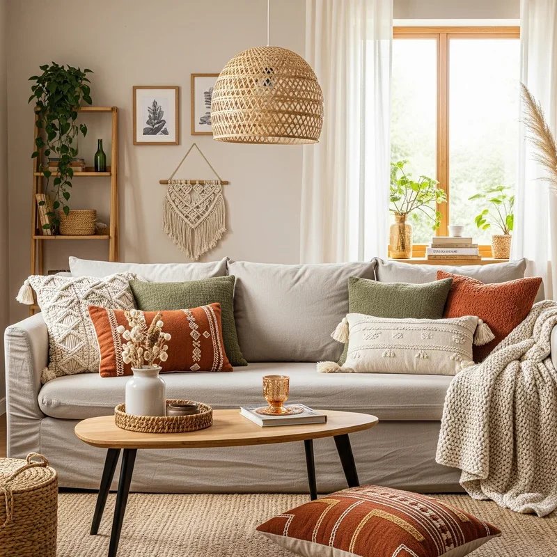 Transform your beige couch into the heart of a bohemian paradise by layering global textiles, eclectic accessories, and warm earthy tones that celebrate collected beauty. Drape colorful throws with tassels and fringe over your neutral sofa, mixing patterns like ikats, suzanis, and mudcloth fearlessly. Add floor cushions in rich jewel tones around your coffee table for additional seating that enhances the relaxed vibe. Macramé wall hangings, woven tapestries, and dream catchers add vertical interest without permanent commitment. Include vintage brass accents, Moroccan lanterns, and carved wooden elements that tell stories of faraway places. Your beige couch grounds all these elements, preventing the space from feeling chaotic or overwhelming. Layer multiple rugs at angles, hang plants in macramé holders, and display collections of pottery or baskets. This maximalist approach proves that beige furniture can support bold, adventurous styling while maintaining sophisticated comfort.
