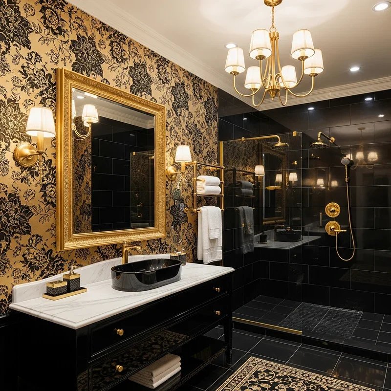 Introduce pattern and texture through gold wallpaper featuring black designs that add depth without overwhelming your bathroom space. Damask patterns create traditional elegance, while geometric prints offer contemporary flair that feels fresh and current. The metallic quality of gold wallpaper reflects light, making small bathrooms feel larger and more luminous. Choose moisture-resistant wallpaper specifically designed for bathrooms to ensure longevity in humid conditions. Feature walls behind vanities or in powder rooms create focal points without committing to full coverage. Textured wallpapers with raised black patterns add tactile interest that flat paint can't achieve. The interplay between shimmering gold backgrounds and matte black patterns creates sophisticated contrast. Consider removable wallpaper options for renters or commitment-phobes who want flexibility. This approach allows you to incorporate intricate designs and patterns that would be difficult or expensive to achieve with tile or paint alone.