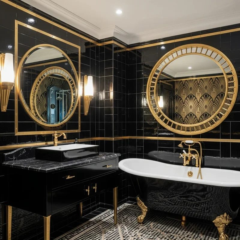 Channel the roaring twenties with Art Deco-inspired design that celebrates geometric patterns, luxurious materials, and the perfect marriage of black and gold. Incorporate fan patterns, sunburst mirrors, and zigzag designs that capture the era's optimistic glamour. Hexagonal tiles, stepped forms, and symmetrical layouts create the mathematical precision Art Deco is famous for. Add period-appropriate fixtures like fluted gold sconces or geometric pendant lights that cast dramatic shadows. Black and gold geometric wallpaper or tile patterns on accent walls transport you to the Jazz Age. Include luxurious materials like marble, brass, and mirror to enhance the opulent feeling. Curved corners on mirrors and furniture soften the geometric elements while maintaining period authenticity. This design approach creates a bathroom that feels like a scene from The Great Gatsby, where every detail contributes to an atmosphere of sophisticated celebration.