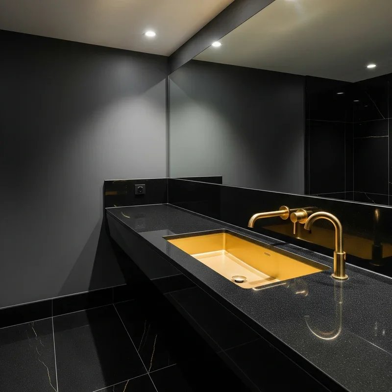 Make a bold statement with black granite or quartz countertops featuring a stunning gold or brass vessel sink that becomes functional art. This unexpected combination challenges traditional bathroom design while creating undeniable luxury that guests won't forget. The contrast between the dark, solid countertop and the gleaming metallic sink creates visual tension that energizes the space. Choose from hammered brass for texture, polished gold for glamour, or brushed gold for understated elegance. Vessel sinks naturally sit higher, creating ergonomic benefits while showcasing their beautiful materials. Pair with wall-mounted gold faucets to maintain clean counter lines and emphasize the sink's sculptural quality. Black countertops hide water spots and daily wear while providing a dramatic stage for your golden centerpiece. This combination works especially well in powder rooms where you want maximum impact in minimal space.