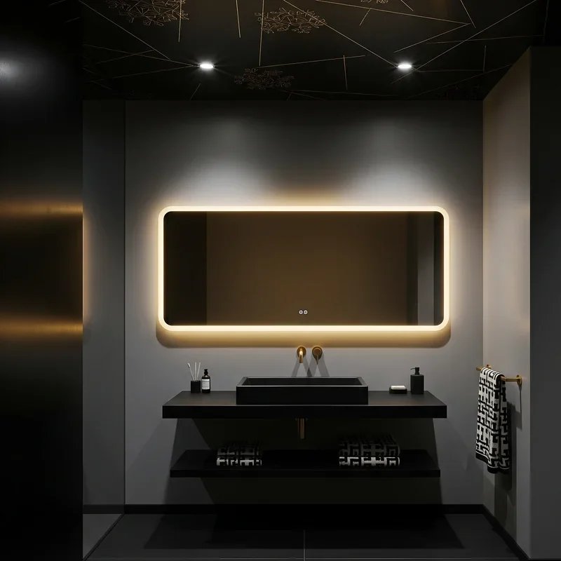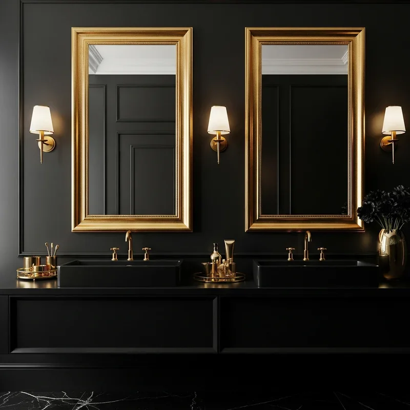 Elevate your bathroom's sophistication with ornate gold-framed mirrors that serve as functional art pieces while amplifying light and space. Choose from baroque-inspired designs with intricate detailing for traditional elegance, or sleek geometric frames for contemporary appeal. Oversized mirrors make small bathrooms feel twice their size while creating a luxury hotel atmosphere. Layer multiple mirrors in varying sizes for a collected-over-time look that adds personality without overwhelming the space. Vintage gold frames from antique shops bring authentic character, while modern interpretations offer durability with easier maintenance. Position mirrors strategically to reflect beautiful fixtures or views, multiplying their visual impact. LED-backlit mirrors with gold frames combine old-world glamour with modern functionality, providing perfect lighting for grooming tasks. The reflective surfaces of both mirror and gold frame work together to brighten even the darkest black bathroom, creating balance between drama and practicality.