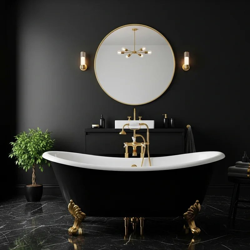 Create a dramatic centerpiece with a black freestanding tub featuring gold claw feet, trim, or hardware that combines bold color with classic elegance. This statement piece commands attention while providing the ultimate relaxation destination in your bathroom sanctuary. Matte black exteriors offer modern sophistication, while glossy finishes create mirror-like reflections that amplify surrounding gold elements. Position the tub strategically to maximize visual impact, perhaps near a window or centered in the room. Gold accents can be subtle like thin rim details or bold like entirely gold feet that elevate the tub literally and figuratively. Add a gold floor-mounted tub filler for cohesive luxury that completes the vignette. The contrast between the dark tub and bright accents creates visual weight that grounds your bathroom design. This investment piece becomes the undeniable star of your bathroom, making every bath feel like a special occasion.