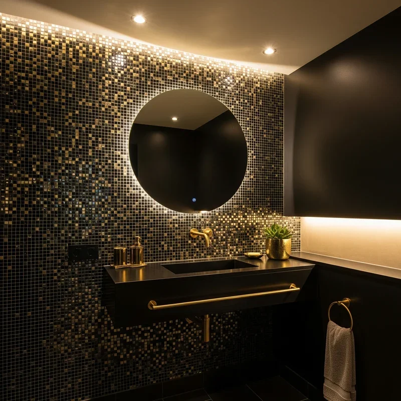 Create a shimmering focal point with a mosaic accent wall that combines black and gold tiles in intricate patterns. This artistic approach transforms a simple wall into a stunning backdrop that catches light and creates movement. Use small tiles to create detailed patterns or larger pieces for bold, graphic designs that make a statement. Mix matte black tiles with metallic gold for textural contrast that adds depth and dimension. Consider creating an ombré effect that transitions from black to gold, or geometric patterns that play with proportion. Position the accent wall behind a vanity, tub, or as a shower feature for maximum impact. The reflective quality of gold tiles amplifies light, preventing the black from feeling too heavy. This technique allows you to incorporate glamour without overwhelming the entire space, perfect for those who want drama in controlled doses.