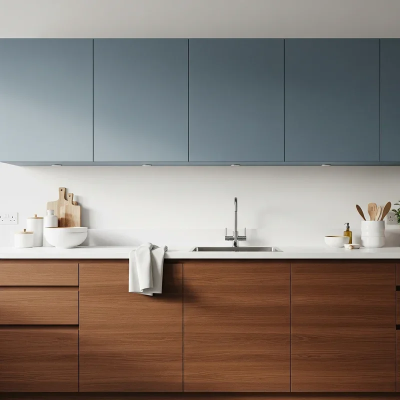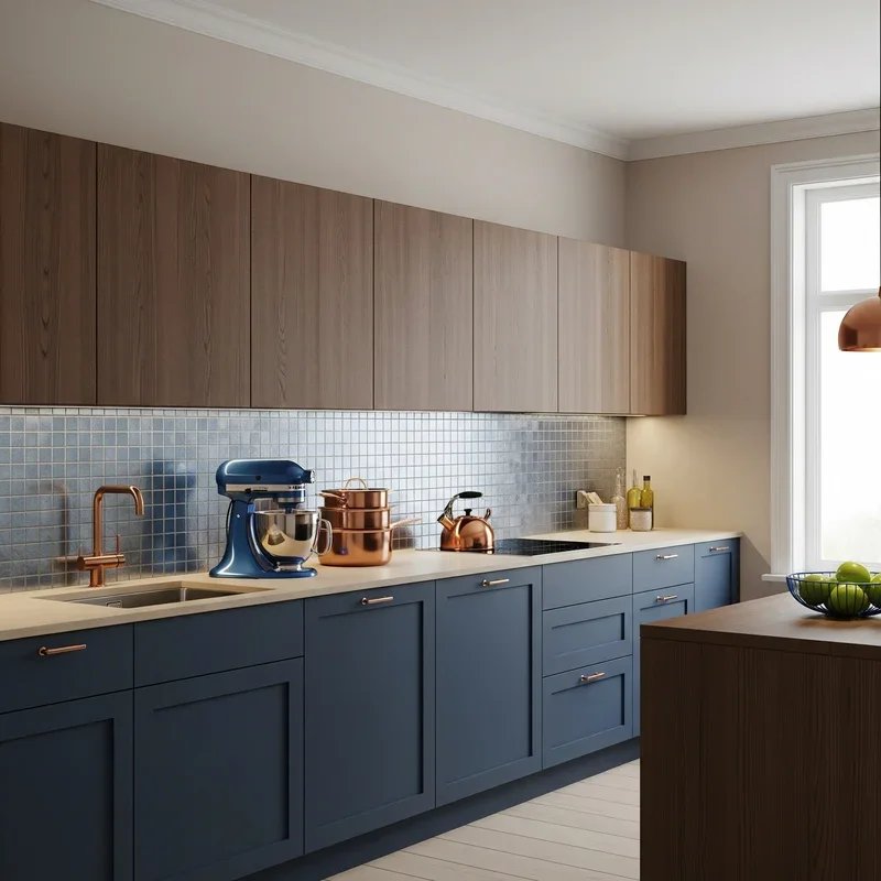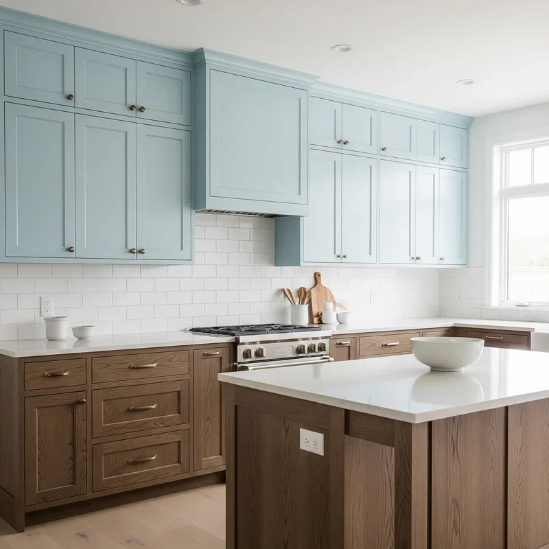 Break the monotony of single-color cabinetry by installing blue upper cabinets and brown lower cabinets for a dynamic two-tone design. This approach creates visual interest while serving practical purposes, as darker lower cabinets hide wear and stains better than lighter colors. The blue upper cabinets draw eyes upward and make the kitchen feel taller, while brown base cabinets ground the space and provide stability. This color distribution mimics nature, with sky above and earth below, creating an inherently balanced feeling. Choose lighter blues for uppers to maintain airiness and deeper browns for lowers to anchor the design. The horizontal color break naturally occurs at counter height, creating a defined workspace zone. Add a coordinating backsplash that incorporates both colors to unite the two-tone scheme. This design strategy allows you to enjoy both colors without overwhelming the space with either one.