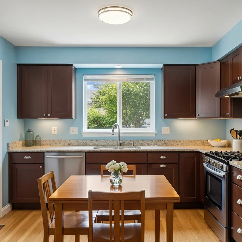 Transform your kitchen into a serene oasis by painting walls in soft sky blue while grounding the space with rich chocolate brown cabinets. This combination creates an atmosphere reminiscent of clear summer days, where earth meets sky in perfect harmony. The light blue walls reflect natural light beautifully, making your kitchen feel larger and airier, while the dark brown cabinets add weight and sophistication. This color scheme works particularly well in kitchens with lots of natural light, as the blue walls amplify brightness while brown cabinets provide necessary contrast. Add white or cream countertops to bridge these colors and prevent the space from feeling too divided. Consider incorporating stainless steel appliances that complement both colors without favoring one over the other. Open shelving in the same brown tone displays colorful dishes that pop against blue walls. This design approach creates a kitchen that feels both grounded and uplifting.