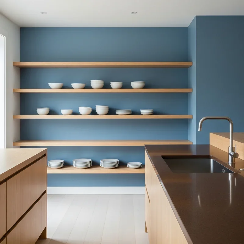 10. Natural Wood Open Shelving Against Blue Walls