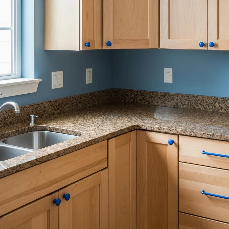 15. Brown Granite with Blue Cabinet Hardware