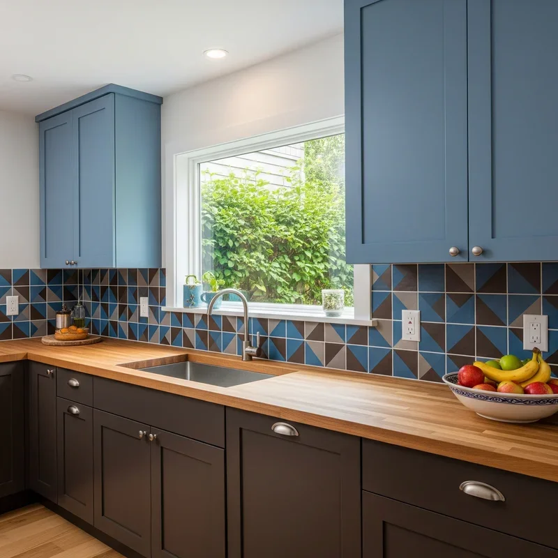 Create a stunning focal point with patterned tiles that incorporate both blue and brown in intricate designs. Moroccan, geometric, or encaustic tiles featuring both colors unite your palette while adding artistic flair to your kitchen. These patterns provide visual interest that plain tiles can't match, turning your backsplash into functional art. The key lies in choosing patterns where blue and brown complement rather than compete, creating harmony through design. Install patterned tiles as a full backsplash or create a decorative strip with solid tiles above and below. This approach allows you to incorporate both colors without committing to solid blocks of either. Consider patterns with white or cream backgrounds that provide breathing room between colors. The intricate designs draw attention and become conversation starters when entertaining. This technique works especially well in kitchens with simple cabinetry that benefits from decorative enhancement.