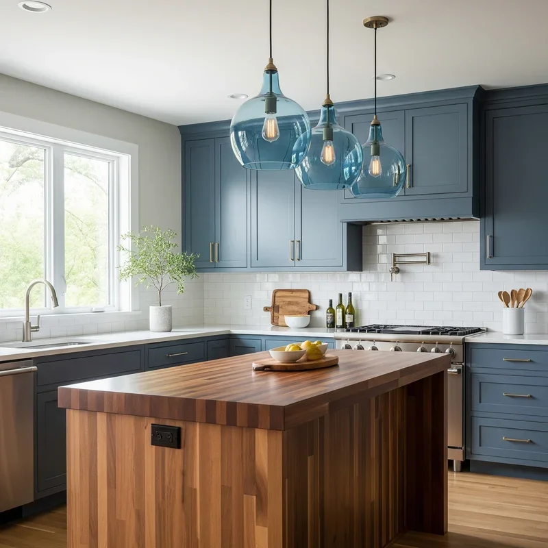 Hang stunning blue glass pendant lights above a brown butcher block island or countertops for a combination that merges function with artistic beauty. The transparency of blue glass allows light to filter through, casting subtle blue tones that enhance the warm wood below. Multiple pendants create rhythm and repetition that draws eyes along the counter length. Choose from various blue glass shades, from sea glass to cobalt, depending on your desired intensity. The organic patterns in butcher block wood provide natural artwork that's enhanced by strategic lighting. This combination works especially well in kitchens with neutral cabinets that benefit from color and texture additions. The pendant lights become jewelry for your kitchen, adding glamour to utilitarian spaces. Consider adjustable heights for pendants to accommodate different tasks and create visual variety. The interplay between transmitted blue light and warm wood creates ever-changing ambiance throughout the day.