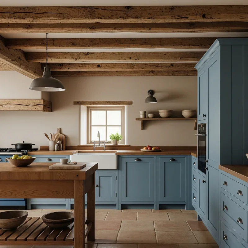 Embrace farmhouse charm by exposing or adding rustic brown ceiling beams above blue painted cabinets for a kitchen that feels both cozy and fresh. The natural wood beams add architectural interest and warmth overhead, while blue cabinets keep the space from feeling too heavy or dark. This combination creates the perfect balance between rustic and refined, suitable for country homes or urban apartments seeking character. The horizontal lines of beams draw eyes across the room, making narrow kitchens feel wider. Choose distressed or reclaimed wood for authentic rustic appeal, or use faux beams for easier installation and maintenance. Paint cabinets in soft blue-gray for subtle elegance or bright blue for cheerful energy. The contrast between rough wood texture and smooth painted surfaces adds tactile variety. This design approach creates a kitchen with stories to tell, where modern convenience meets timeless charm.