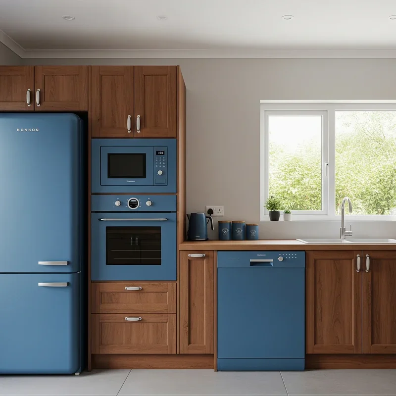 14. Blue Kitchen Appliances with Brown Cabinetry
