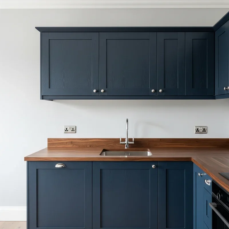 Create stunning contrast by pairing deep navy blue cabinets with rich walnut countertops that bring natural warmth to your kitchen's cool foundation. This sophisticated combination feels both timeless and trendy, offering the perfect balance between modern style and organic beauty. The dark blue cabinets provide drama and depth while walnut's natural grain patterns add visual interest and prevent the space from feeling too uniform. Consider adding brass or gold hardware to bridge these two colors beautifully, creating a luxurious touch that elevates the entire design. The walnut's warm undertones soften the navy's intensity, making the kitchen feel inviting rather than imposing. This pairing works especially well with white or cream walls that allow both colors to shine without competition. Add under-cabinet lighting to highlight the beautiful wood grain while creating ambiance for evening cooking. The result is a kitchen that feels like it belongs in a high-end design magazine.