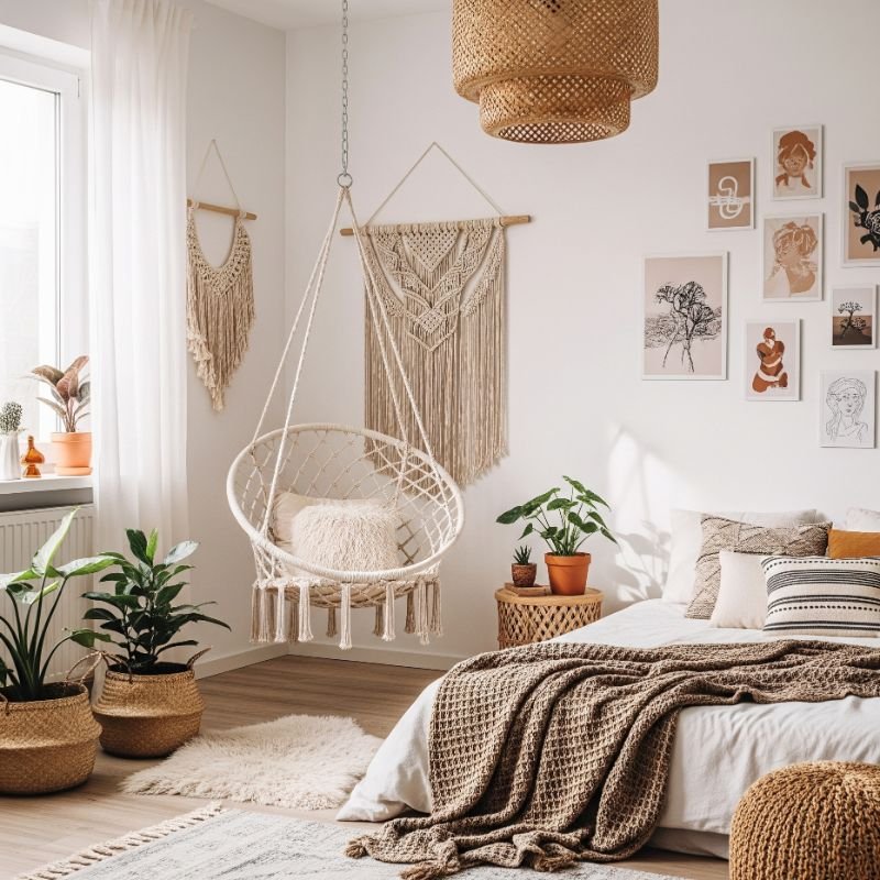 Install a hanging chair or hammock to create a cozy reading nook that embodies boho's relaxed lifestyle. These swinging seats range from $80 macramé versions to $400 egg chairs with stands. The gentle motion soothes while the enclosed feeling provides a perfect escape within your bedroom. Position near windows for natural light or in corners to maximize floor space. Add plenty of cushions and throws for ultimate comfort during extended lounging sessions. Ceiling mounting requires finding studs and using appropriate hardware for safety. Freestanding versions offer flexibility but need adequate floor space. The playful element adds whimsy while serving practical seating needs. This feature becomes a room's focal point, drawing eyes upward and creating visual interest at varying heights. Style with coordinating textiles that tie into your overall color scheme.