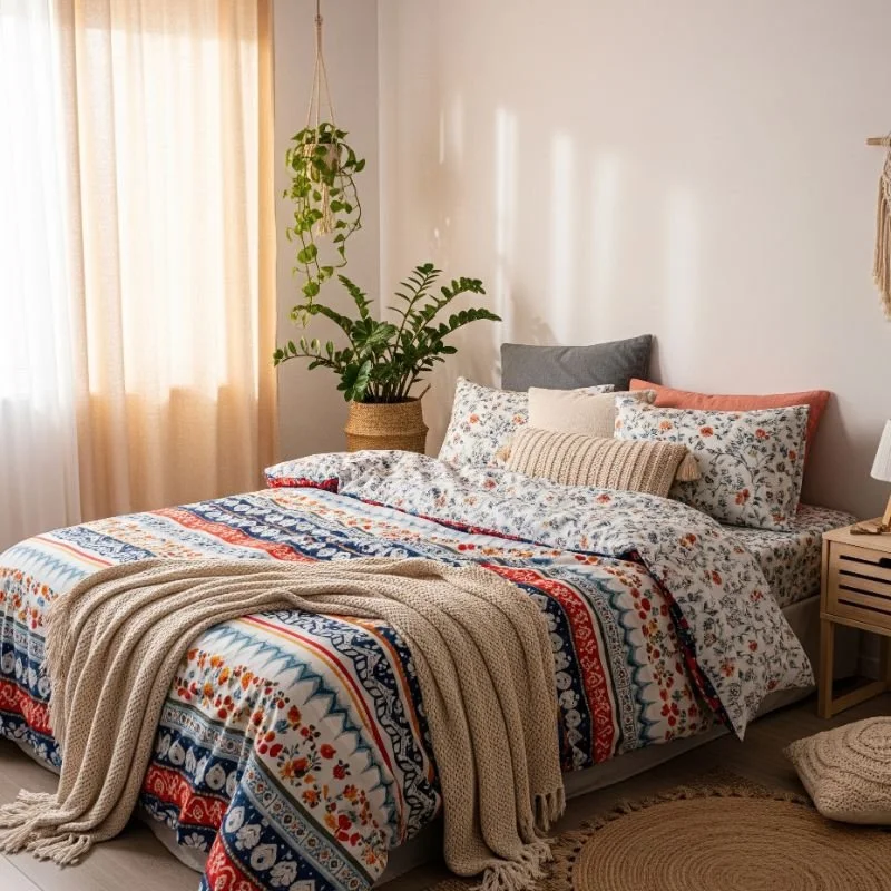 Master the boho art of pattern mixing by combining prints that shouldn't work together but somehow do beautifully. Start with a base pattern like stripes or small florals, then add contrasting designs in complementary colors. Think paisley duvet with geometric shams and a floral throw blanket. The secret lies in maintaining a consistent color palette while varying scale and design style. Budget $100-300 for quality bedding sets that withstand frequent washing. Include solid-colored pieces to give the eye resting spots amid the pattern party. Vintage sheets and pillowcases from thrift stores add authentic character for pennies. The goal is creating a bed that looks effortlessly assembled from treasured pieces collected during world travels. This approach to bedding makes every night feel like sleeping in an artist's studio apartment in Paris.
