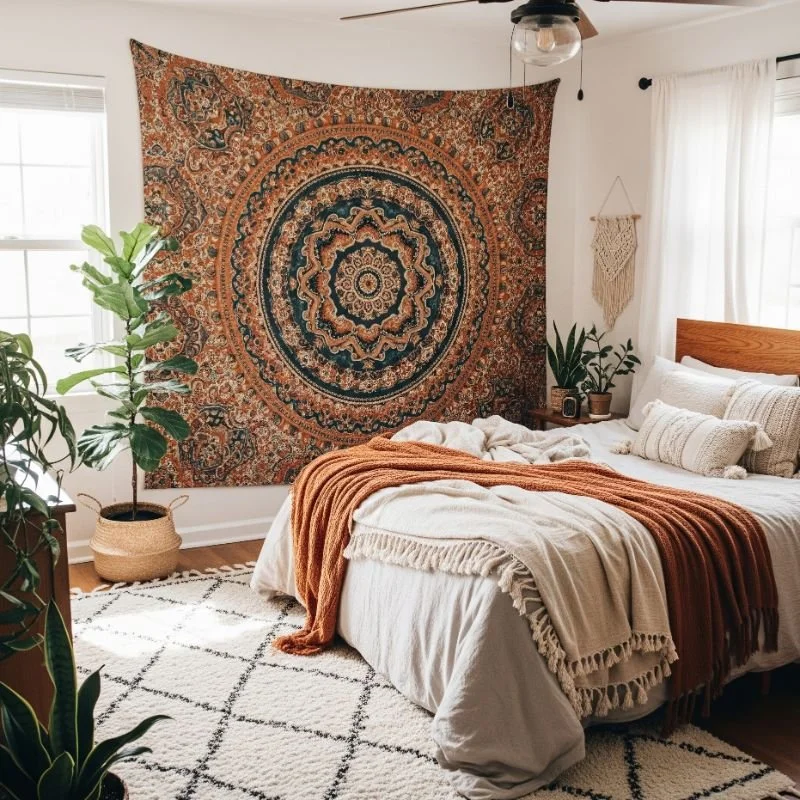 Create instant focal points with tapestries that transform blank walls into artistic statements. These large fabric pieces cost $20-100 and install easily with clips or nails, making them perfect for renters. Choose designs featuring mandalas, nature scenes, or geometric patterns in colors complementing your palette. The soft fabric adds sound absorption while hiding imperfect walls. Position behind beds as textile headboards or on the largest wall for maximum impact. Layer smaller tapestries or combine with other wall decor for gallery effects. The flowing fabric adds movement and softness that painted walls can't achieve. Iron or steam before hanging to remove packaging creases. This temporary decor solution allows seasonal changes or easy updates as style evolves. UV-resistant options prevent fading in sunny rooms while machine-washable versions simplify maintenance.