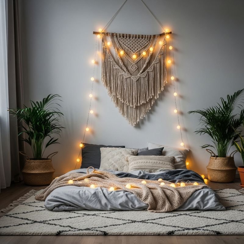 Weave magic into your bedroom with string lights that create soft, ambient lighting perfect for boho spaces. Drape them along walls, around bed frames, or create canopies of light overhead. LED options cost $15-50 and offer energy efficiency with various warmth levels. Choose warm white for classic ambiance or multicolored for playful vibes. The gentle glow eliminates harsh overhead lighting needs while creating an intimate atmosphere. Combine with sheer fabrics for diffused lighting effects that feel professionally designed. Battery-operated versions offer flexibility without visible cords disrupting the aesthetic. Layer different string types: globe bulbs for statement lighting, fairy lights for delicate touches. Timer functions allow automatic evening ambiance without daily management. This affordable lighting solution transforms ordinary rooms into enchanted spaces worthy of fairytales. Position lights to highlight favorite areas like reading nooks or gallery walls.