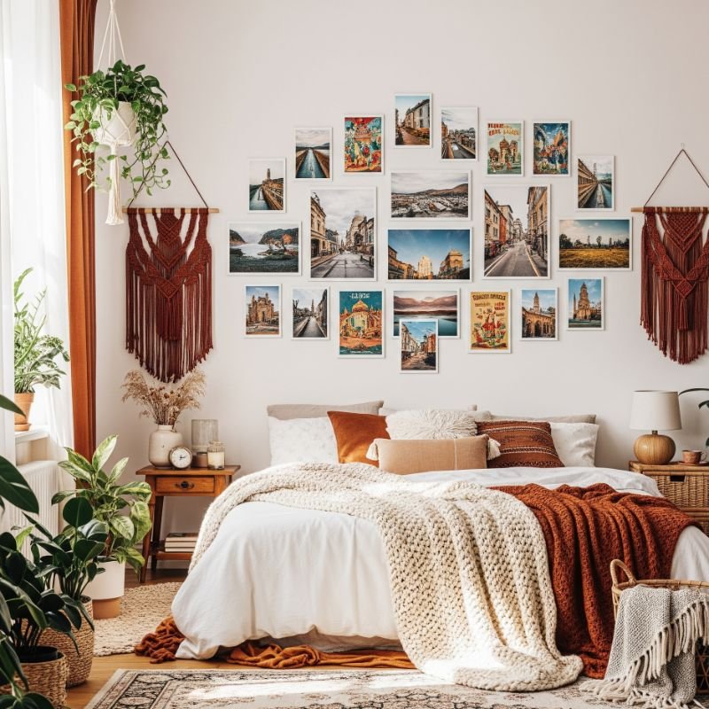 Create a personal museum of memories with gallery walls featuring travel photos, postcards, pressed flowers, and collected artwork. Mix frame styles and sizes for that perfectly imperfect boho look, incorporating natural wood, painted vintage frames, and even frameless clips. This visual storytelling costs as little as $30 using thrift store frames and personal photos. Include maps, ticket stubs, and handwritten quotes for variety beyond standard photos. Arrange pieces organically, starting with larger anchor pieces and filling gaps with smaller items. The asymmetrical layout feels more authentic than rigid grids. Add small shelves within the gallery for displaying tiny treasures and rotating seasonal items. This ever-evolving display reflects your journey and interests, making the bedroom uniquely yours. Leave space for future additions, letting your gallery grow with new adventures and discoveries.