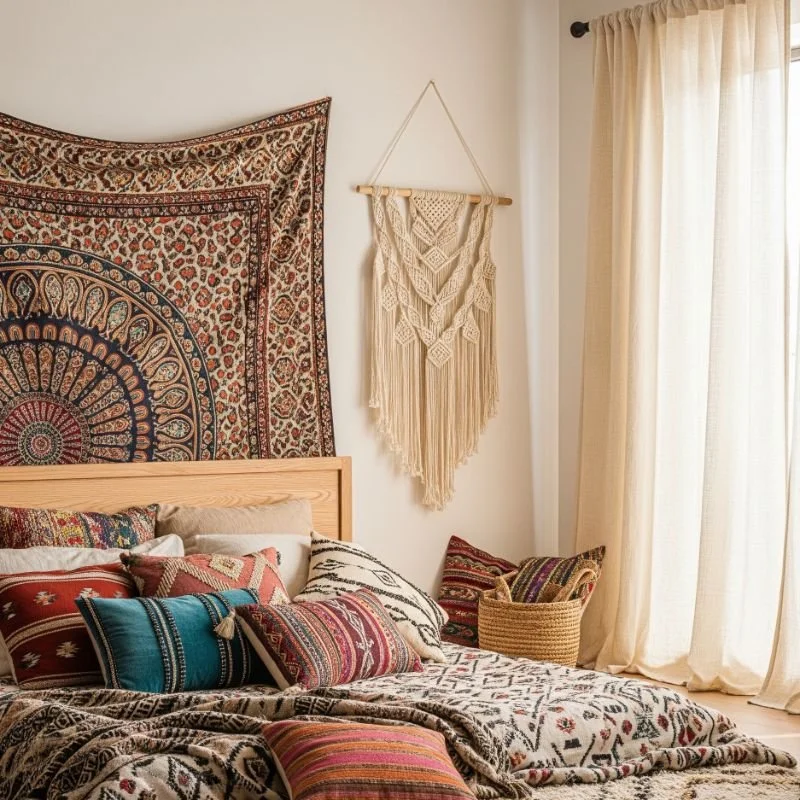 Celebrate worldly style by mixing textiles from different cultures and continents in harmonious chaos. Combine Indian block prints with African mudcloth, Mexican serapes with Japanese shibori, creating a United Nations of fabric. This approach costs vary widely, from $20 thrift store finds to $200 authentic handwoven pieces. The key lies in finding common color threads that unite diverse patterns and textures. Use these textiles as pillow covers, wall hangings, bed runners, or furniture throws. Each piece should tell a story or evoke travel memories, even if purchased locally. The cultural mixing reflects boho's inclusive, boundary-free philosophy. Educate yourself on textile origins to appreciate and respect their cultural significance. This global approach creates rooms rich with meaning and visual interest that spark conversations and inspire wanderlust dreams.