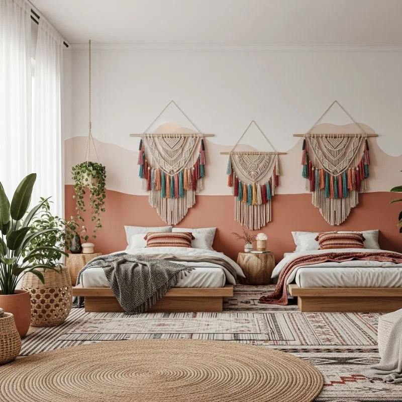 Nothing says boho quite like the intricate knots and natural fibers of macramé art adorning your walls. These handcrafted pieces add instant texture and visual interest while maintaining that effortless, artistic vibe. Choose large statement pieces above the bed as alternative headboards or create galleries with multiple smaller hangings. Natural cream and beige tones keep things neutral, while dyed versions in terracotta or sage add subtle color. Prices range from $30 for small pieces to $300 for elaborate wall-sized creations. The organic shapes and flowing fringe create movement in otherwise static spaces. Position near windows where natural light can cast intricate shadows throughout the day. DIY enthusiasts can learn basic knots from online tutorials, creating custom pieces for under $20 in materials. This textile art bridges the gap between craft and sophistication.