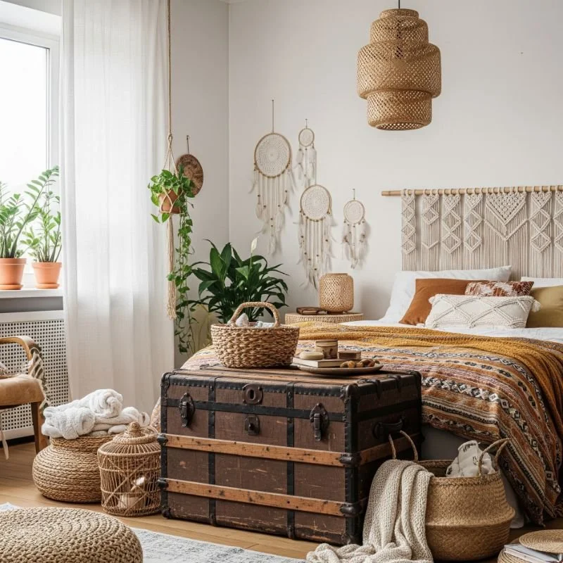 Solve storage challenges while adding character with vintage trunks that double as decor and organization. Position at the foot of the bed for extra blanket storage or use as unique nightstands flanking the bed. These pieces range from $50 flea market finds to $300 restored antiques. The weathered leather, aged wood, and tarnished metal hardware add authentic vintage appeal. Stack smaller trunks for vertical storage or use one large piece as a coffee table in sitting areas. The enclosed storage hides clutter while maintaining the collected-over-time aesthetic. Look for unique details like travel stickers, brass corners, or canvas covering that tell stories. Interior compartments organize smaller items perfectly. These functional antiques add history and soul to bedrooms while solving modern storage needs. Each trunk becomes a conversation piece that enhances the globally-inspired boho narrative.