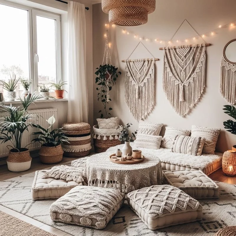 Embrace low-level living with an array of floor cushions that create flexible seating while maintaining the relaxed boho vibe. Large Moroccan-style poufs, meditation cushions, and oversized pillows in rich fabrics transform floor space into comfortable lounging areas. Invest $30-100 per cushion in quality pieces that maintain shape with use. Arrange them around a low table for tea ceremonies or stack against walls when not needed. Choose materials like velvet, kilim, or embroidered cotton that add textural interest. The informal seating encourages cross-legged conversations and afternoon reading sessions. Mix sizes and shapes: round, square, and cylindrical options create visual variety. This flexible furniture solution works especially well in small bedrooms where traditional chairs feel bulky. Store extra cushions in large baskets, making them accessible while maintaining tidiness.