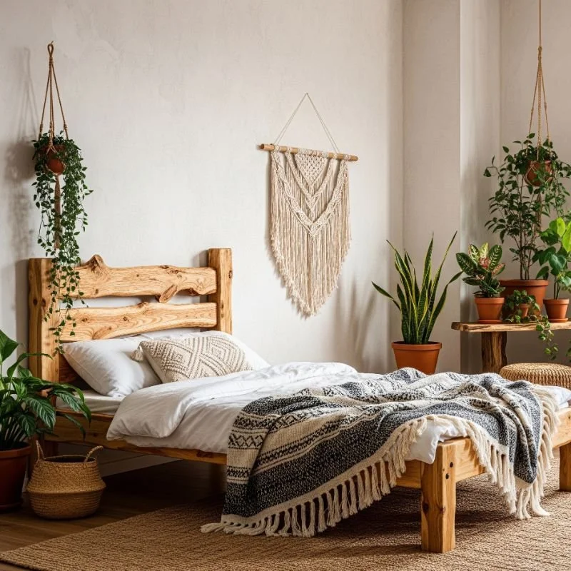 Incorporate raw, natural wood pieces that ground the space and add organic warmth essential to boho design. Think live-edge nightstands, driftwood wall art, or reclaimed barn wood headboards that bring nature indoors. These elements range from free beach finds to $500 custom furniture pieces. The imperfections in natural wood, like knots and grain variations, add character that manufactured furniture lacks. Use tree stump side tables, wooden crates as shelving, or branches as curtain rods for authentic touches. Sand lightly but maintain the raw texture that makes each piece unique. The warm tones of natural wood balance cooler elements like metals and stones in your design. Position larger pieces as focal points while scattering smaller wooden accents throughout. This connection to nature creates a grounding energy that promotes restful sleep.