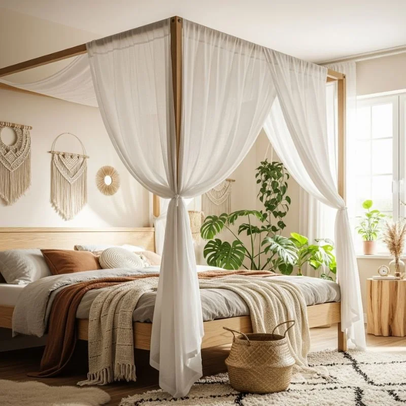 Transform your sleeping space into a dreamy retreat with flowing canopies that add vertical drama and intimate coziness. Use ceiling-mounted curtain rods, wooden dowels, or even embroidery hoops to create the structure, then drape with lightweight fabrics like cotton voile, linen, or mosquito netting. The ethereal effect costs $50-200 depending on your approach and fabric choices. Let panels puddle romantically on the floor or tie them back with rope for daytime openness. White creates an airy feel while jewel tones add drama and warmth. The enclosed feeling satisfies our primal need for security while maintaining the free-flowing boho aesthetic. Add fairy lights within the canopy for magical nighttime ambiance. This simple addition makes any bed feel like a luxury retreat worthy of Instagram envy.