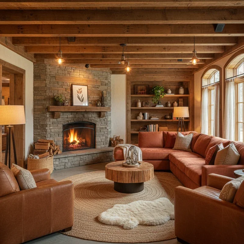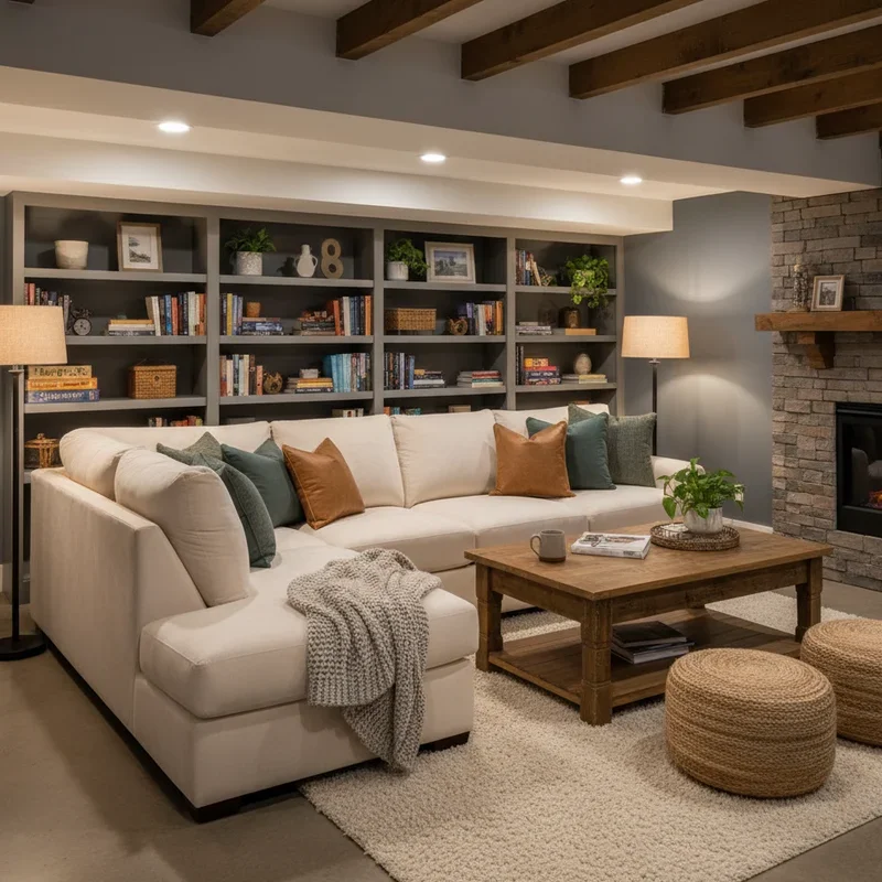 A plush sectional sofa is like a warm hug for your basement, creating an instant gathering spot that defines the space! Choose deep-seated options with soft cushions that invite lounging and afternoon naps. L-shaped or U-shaped configurations maximize seating while creating intimate conversation areas. Opt for performance fabrics that handle basement moisture and heavy use while maintaining that soft, cozy feel. Add plenty of throw pillows in varying sizes and textures for ultimate comfort customization. Position your sectional to face the TV, fireplace, or best view, creating natural flow through the space. Consider sectionals with built-in recliners or chaise lounges for next-level relaxation. The color should complement your warm palette while being forgiving of movie night snacks. Your sectional becomes the basement's anchor, making everyone feel instantly at home!