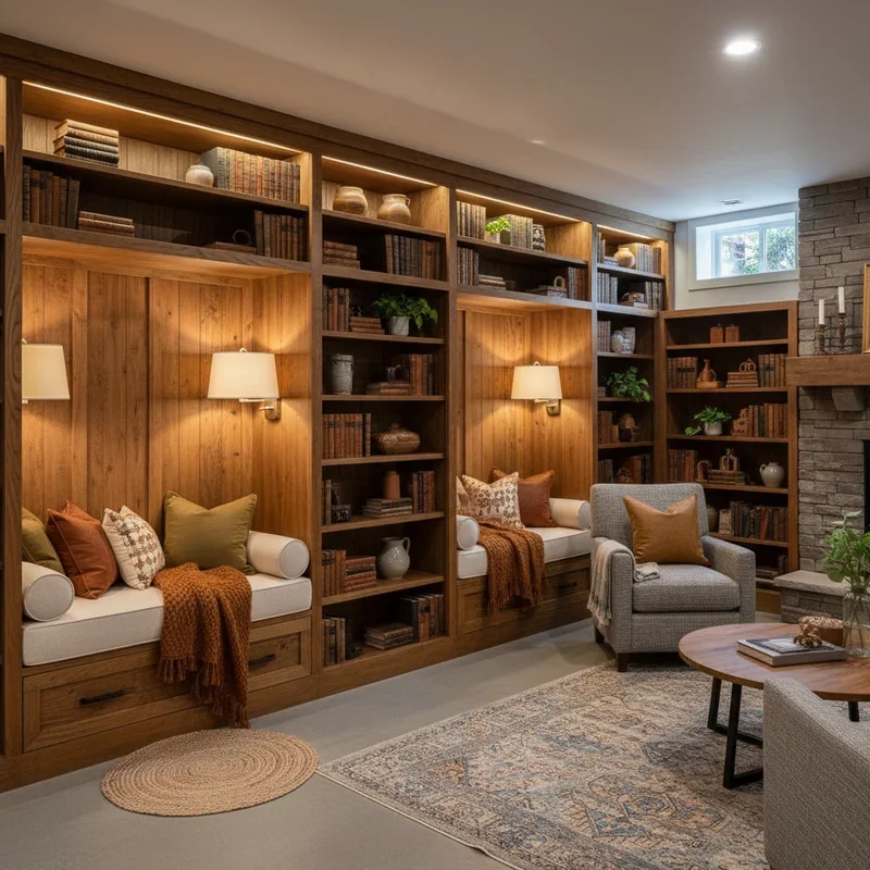 Transform dead wall space into literary heaven with floor-to-ceiling built-in bookshelves that scream sophistication and warmth! Books aren't just for reading; they're instant insulation, sound absorption, and decoration rolled into one. Create a dedicated reading nook with a comfortable chair, good lighting, and a small side table for your coffee. Built-ins maximize vertical space while making your basement feel custom-designed rather than forgotten. Mix books with decorative objects, plants, and personal photos to avoid that library-sterile feeling. Add LED strip lighting inside shelves to highlight your collection and create ambient glow. Position your reading chair near any natural light source, or create your own with a well-placed floor lamp. This setup transforms your basement from storage space to intellectual sanctuary where you actually want to spend time!