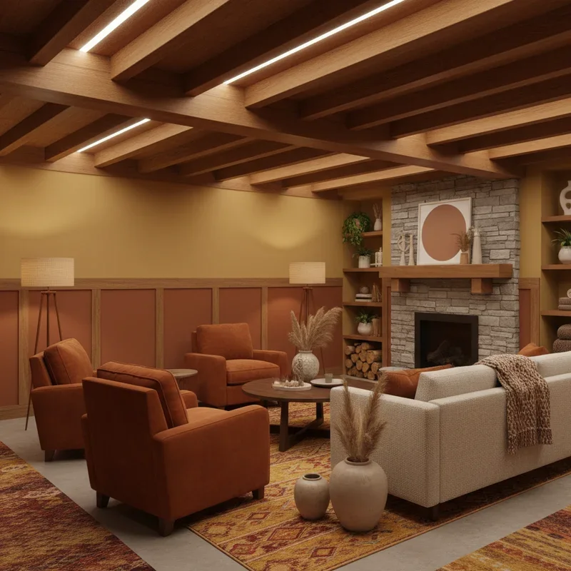 Turn that low basement ceiling into an architectural feature by exposing and finishing ceiling beams! Paint beams in warm wood stains or classic white for farmhouse charm. The horizontal lines created by beams add visual interest while making spaces feel larger. Leave some ceiling areas open between beams for an industrial-loft feeling that's surprisingly cozy. Add rope lighting or LED strips along beams for ambient uplighting that makes ceilings appear higher. Hang pendant lights or plants from beams to draw eyes upward and add personality. Exposed beams work especially well with painted or natural wood ceilings between them. This treatment transforms your basement ceiling from forgotten surface to stunning focal point. The rustic charm of exposed beams makes your basement feel like a mountain lodge retreat!