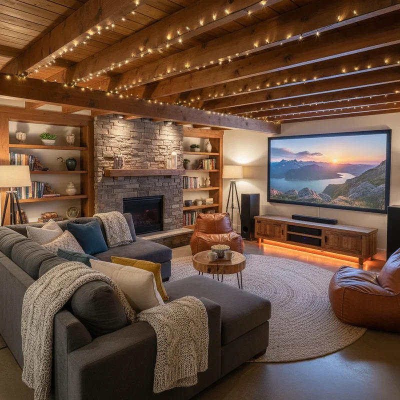 Your basement's natural darkness and sound insulation make it the perfect spot for an epic home theater that rivals commercial cinemas! Install a large screen or projector with surround sound that makes movies come alive. But here's the cozy twist: skip those stiff theater seats for oversized recliners, bean bags, or a massive sectional piled with blankets. Add ottoman storage for snacks and beverages within arm's reach. Install dimmable sconce lighting along walls for safe movement without screen glare. Acoustic panels disguised as artwork improve sound quality while maintaining style. Include a popcorn machine or mini concession area for authentic movie night vibes. Blackout curtains on any windows complete the cinema experience. Your basement becomes the destination for family movie nights and sports events, where comfort meets entertainment!