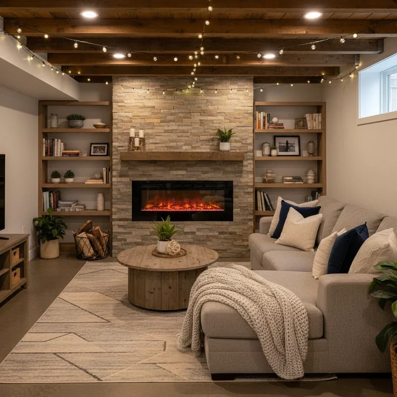 Nothing transforms a cold basement faster than the warm glow and literal heat of a fireplace! Electric fireplaces offer easy installation without chimney requirements, while gas inserts provide real flames for ultimate ambiance. Even a high-quality space heater designed to look like a vintage stove adds both function and charm. Position your fireplace as the room's focal point, arranging furniture to face this cozy beacon. The psychological comfort of a fireplace is unmatched; humans have gathered around fires for thousands of years! Modern electric units offer realistic flame effects, adjustable heat settings, and even color-changing options for mood lighting. Add a mantel for seasonal decorating and personal touches. The crackling sound effects available in many units complete the sensory experience. Your basement becomes the spot everyone gravitates toward on chilly evenings!