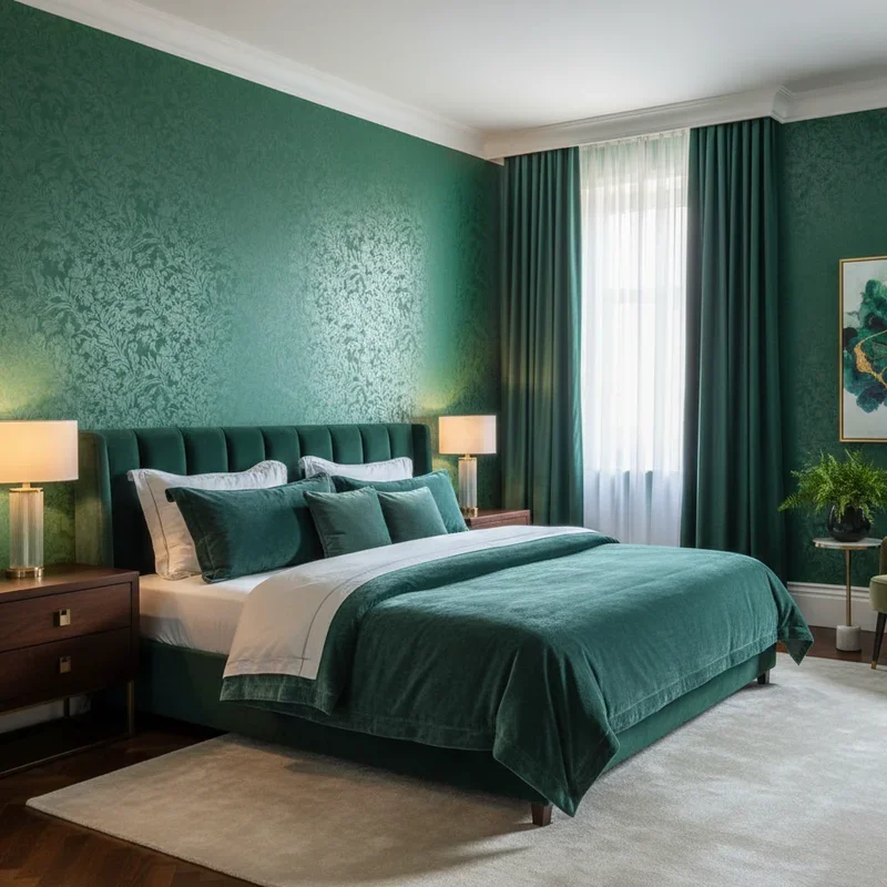 Emerald wallpaper creates instant impact with patterns and textures that paint alone cannot achieve. From tropical palm prints to Art Deco geometrics, wallpaper adds personality while maintaining sophisticated color. Choose moisture-resistant options for longevity, especially if your bedroom includes an ensuite bathroom. Large-scale patterns make small rooms feel grand, while subtle textures add depth without overwhelming. Consider wallpapering just one wall or the ceiling for unexpected drama that doesn't overpower. Metallic accents within the wallpaper pattern catch light beautifully, adding glamour throughout the day. Removable wallpaper options let you experiment without permanent commitment, perfect for renters or design adventurers. The pattern provides visual interest that keeps your emerald theme from feeling flat or boring. Position patterned wallpaper strategically: behind your bed for a headboard effect, or in alcoves for cozy moments.