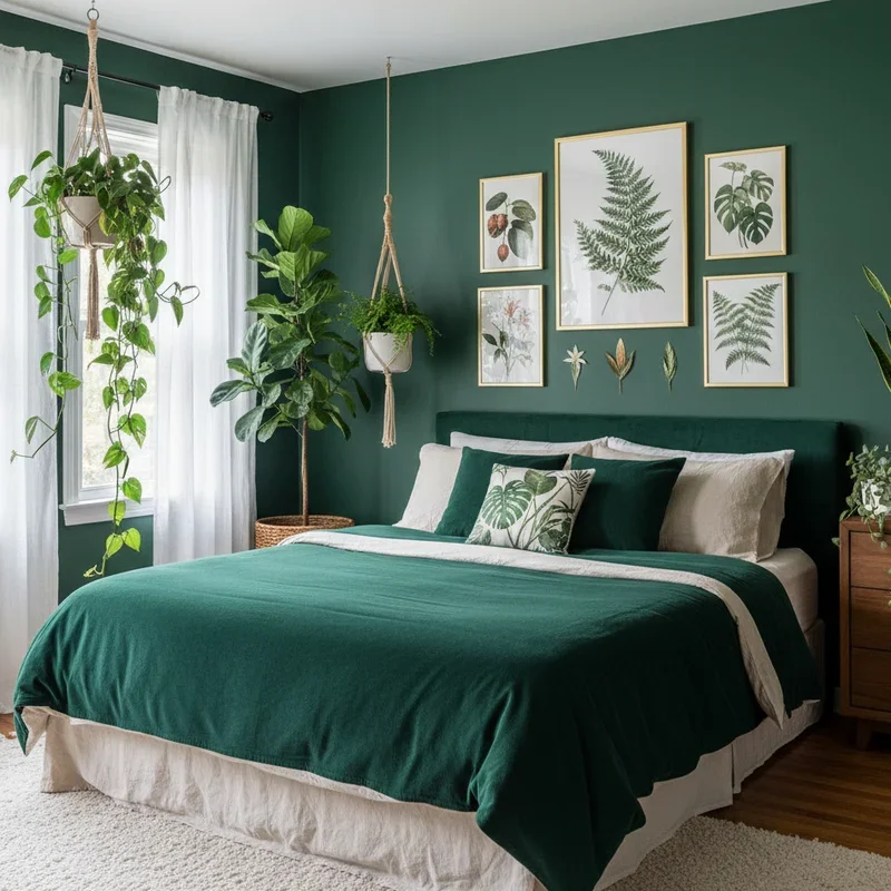 Bringing nature indoors through botanical artwork and living plants amplifies your emerald theme while adding organic authenticity. Large botanical prints in gold frames create gallery-worthy walls, while real plants add life and movement. Choose plants with interesting leaf shapes and varying green tones to complement your emerald base. Hanging planters save floor space while drawing eyes upward, making rooms feel taller. Position plants where they'll thrive: near windows for sun-lovers, or in corners for shade-tolerant varieties. The combination of emerald decor and living greenery blurs the line between indoors and out, creating a bedroom that feels like a sophisticated greenhouse. Botanical prints can be vintage reproductions or modern photographs, maintaining elegance while adding educational interest. This natural approach improves air quality while reinforcing your color scheme organically.