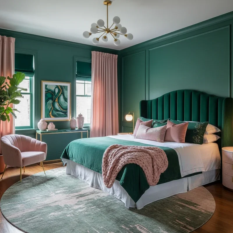 The unexpected combination of emerald and blush pink creates a sophisticated balance between bold and soft that feels fresh and modern. These seemingly opposite colors complement each other perfectly, like a rose garden at dusk. Add blush through throw pillows, artwork, or a cozy reading chair for feminine touches that soften emerald's intensity. The pink warms up the cool green, creating a balanced temperature that feels welcoming year-round. This color story works especially well in bedrooms because it combines energy with tranquility. Keep the ratio roughly 70% emerald to 30% blush for perfect balance without overwhelming either shade. Metallic rose gold accessories bridge the two colors beautifully, adding luxury that elevates the entire scheme. This combination feels both trendy and timeless, sophisticated enough for adults yet playful enough to keep things interesting.