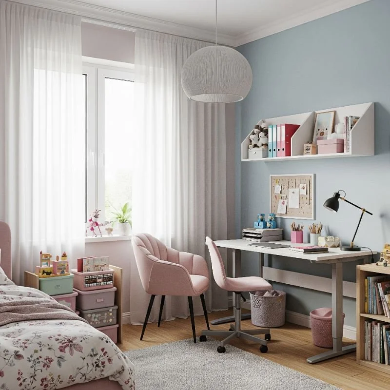 Design a bedroom that seamlessly blends style with academic success through smart organization and dedicated study areas. Create a defined homework zone with proper desk placement near natural light, ergonomic seating, and organized supplies. Include bulletin boards or pegboards for displaying schedules, achievements, and inspiration. Add floating shelves for textbooks and reference materials within easy reach. Incorporate technology thoughtfully with charging stations and cable management systems. Use color psychology with blues and greens in study areas for focus. Balance work with relaxation through comfortable reading chairs and calming décor. Label everything to maintain organization and teach life skills. This practical approach shows that functional can be beautiful while setting up your daughter for academic success throughout her school years.