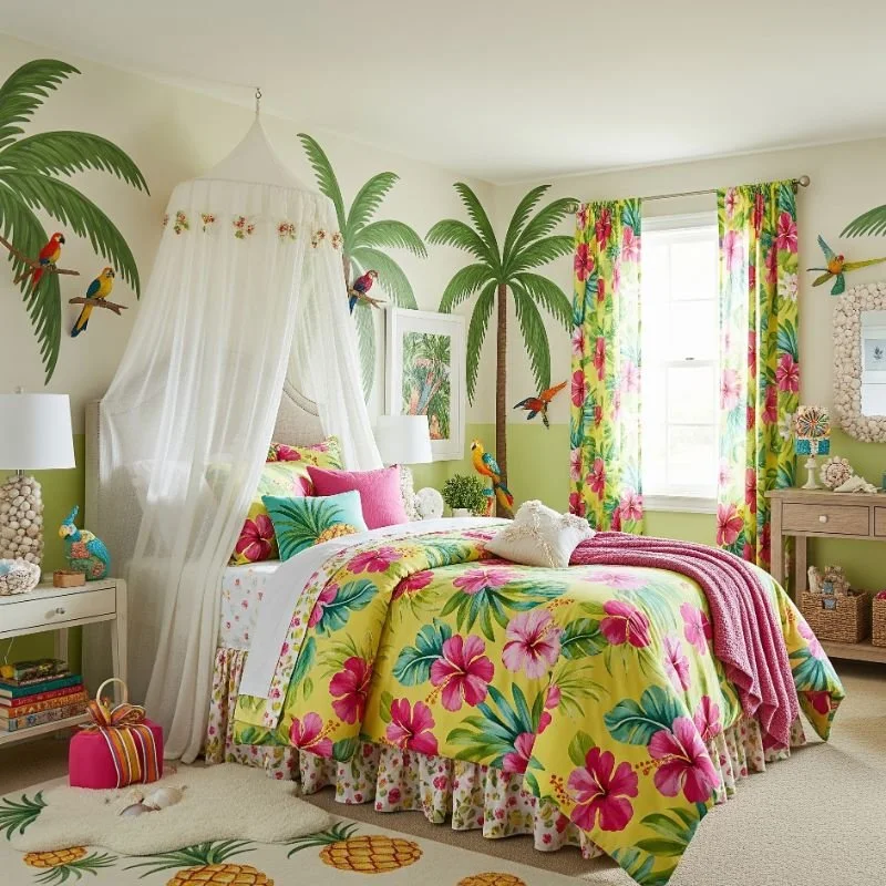 Transport your daughter to an island getaway with a tropical paradise theme that brings vacation vibes home. Paint walls in ocean blues or sunset corals, or use tropical leaf wallpaper as an accent. Incorporate natural textures through bamboo furniture, rattan accessories, and jute rugs. Add palm leaf patterns through bedding, curtains, or wall art. Include fun elements like a hammock chair, surfboard shelving, or tiki-inspired lighting. Display shells, starfish, or coral (faux for sustainability) in glass bowls or shadow boxes. Ceiling fans with palm leaf blades enhance the theme while providing practical comfort. This cheerful design encourages relaxation and daydreaming while creating a unique space that stands out from typical girls' rooms.