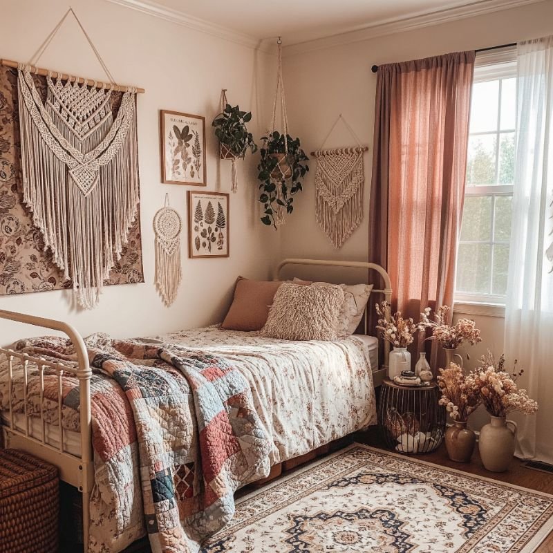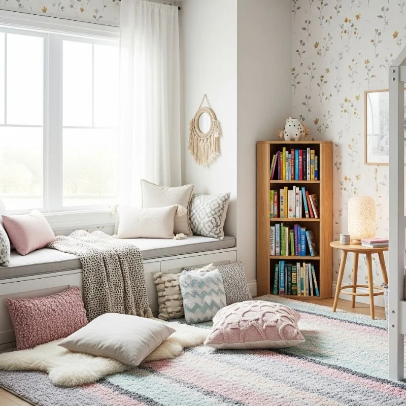Create a free-spirited sanctuary with bohemian elements that encourage creativity and self-expression. Start with a neutral base of whites and creams, then layer in natural textures through jute rugs, macramé wall hangings, and woven baskets. Incorporate plants in hanging planters or on floating shelves to bring life and teach responsibility. Mix patterns fearlessly with tribal prints, florals, and geometric designs in throw pillows and bedding. Add a canopy using sheer curtains or mosquito netting for that dreamy, cocoon-like feeling. Include floor cushions and poufs for flexible seating when friends visit. String lights or paper lanterns provide ambient lighting perfect for bedtime stories or teenage heart-to-hearts. This style celebrates individuality while creating a calming atmosphere.