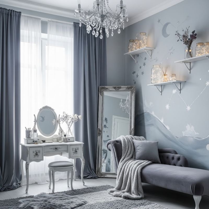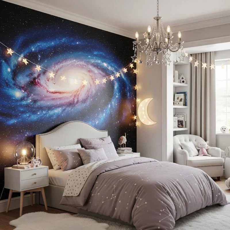 Reach for the stars with a celestial-themed bedroom that inspires wonder about the universe. Paint the ceiling deep blue with glow-in-the-dark stars or install fiber optic lights for a realistic night sky. Use constellation patterns in bedding, curtains, or wall decals. Include moon phases artwork, planet mobiles, or telescope accessories for educational elements. Metallic accents in gold and silver represent stars and add glamour. Navy blue and white create a sophisticated color scheme that grows with her. Add cloud-shaped shelves or star-shaped mirrors for whimsical touches. Include space-themed books and educational posters to encourage STEM interests. This dreamy design sparks curiosity about science while creating a magical sleeping environment perfect for sweet dreams.