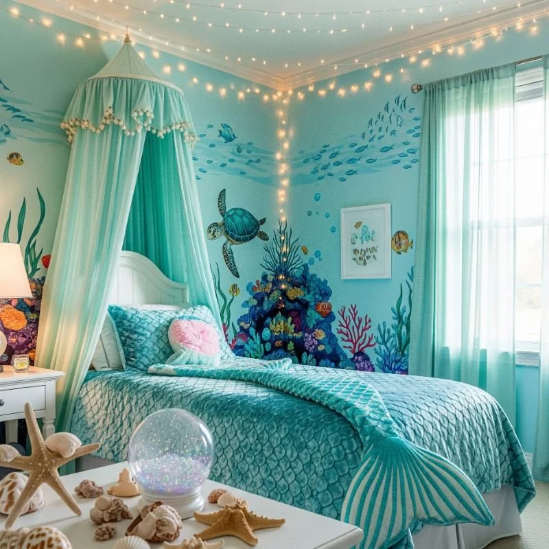 Dive into an underwater adventure with a mermaid theme that balances fantasy with sophistication. Use an ocean-inspired color palette of teals, aquas, and seafoam greens with metallic accents representing scales. Create texture through sequined pillows, iridescent curtains, or net canopies resembling seafoam. Include seashell collections, starfish decorations, and coral-inspired accessories for authentic ocean vibes. Add whimsical elements like a mermaid tail blanket or shell-shaped furniture. Use lighting to create underwater effects with blue bulbs or color-changing LEDs. Display ocean-themed books and educational materials about marine life. This immersive theme sparks imagination while providing opportunities to learn about ocean conservation. The dreamy atmosphere creates a unique space that stands out from typical princess themes.