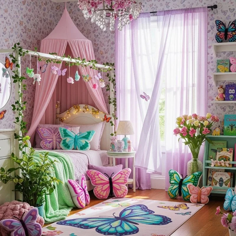 Create an enchanted garden atmosphere with a butterfly theme that brings nature's beauty indoors. Use soft pastels or vibrant jewel tones depending on her preference, incorporating them through butterfly-patterned bedding and curtains. Add dimensional elements with 3D butterfly wall decals arranged in flight patterns. Include real or silk flowers in window boxes or hanging planters to complete the garden feel. Display butterfly collections in shadow boxes or frame botanical prints for educational value. Add whimsical touches like butterfly-shaped shelves or lamp shades. Include garden-themed accessories like birdhouses, watering cans, or garden tools as décor. This nature-inspired theme encourages appreciation for insects and gardens while creating a magical space that feels alive with possibility.