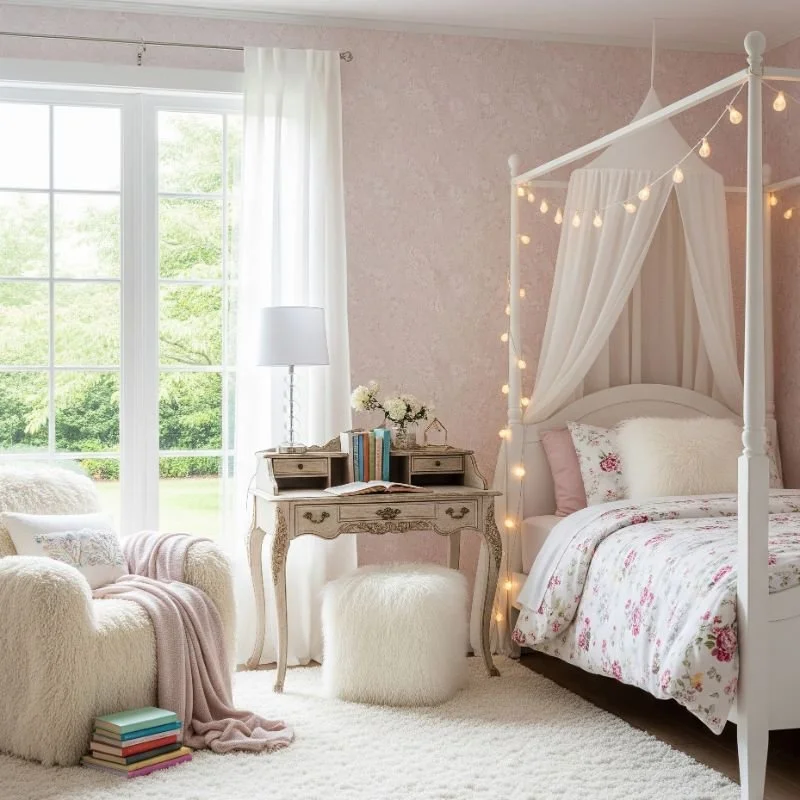 Transport your daughter to the French countryside with a romantic design mixing elegance with rustic charm. Choose a soft color palette of whites, creams, and pastels with toile or floral patterns. Include vintage-inspired furniture with curved lines and distressed finishes for authentic character. Add romantic touches through lace curtains, embroidered pillows, and fresh or silk flowers in mason jars. Display vintage finds like antique frames, old books, or decorative plates on shelves. Include a vanity area with an ornate mirror for getting ready. Wrought iron accents in lighting or furniture legs add French flair. This timeless style teaches appreciation for craftsmanship and detail while creating a sophisticated space that transitions beautifully through different ages.